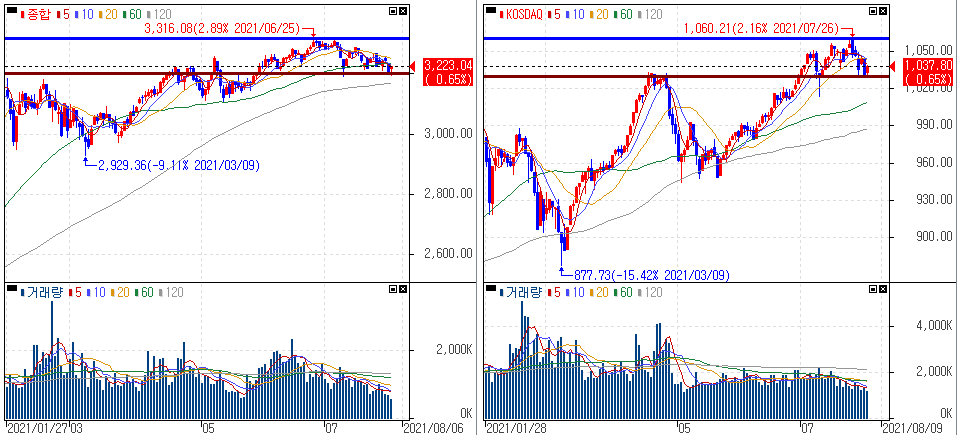 금일 코스피 지수는 +0.65% 상승한 3,223.04에 마감하였고, 코스닥 지수는 +0.65% 상승한 1,037.80에 마감하였습니다. 7월 수출 호조세에 기관과 외국인의 매수로 반등을 보였습니다.