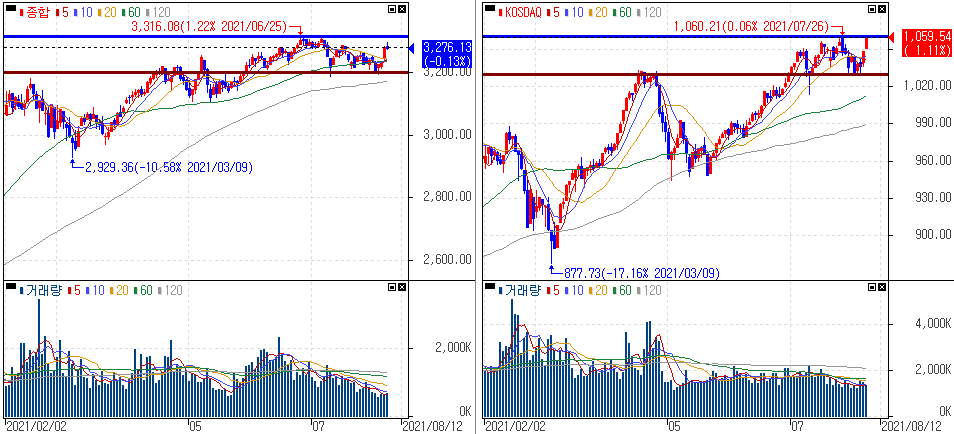 금일 코스피 지수는 -0.13% 하락한 3,276.13에 마감하였고, 코스닥 지수는 +1.11% 상승한 1,059.54에 마감하였습니다. 코스닥은 기관과 외국인의 동반 매수세에 연고점을 경신하였습니다.