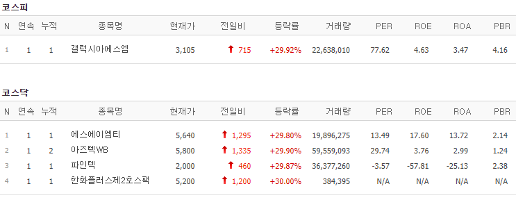 코스피에서는 갤럭시아에스엠이 상한가를 기록했고, 코스닥에서는 에스에이엠티, 아즈텍WB, 파인텍, 한화플러스제2호스팩이 상한가를 기록했습니다.