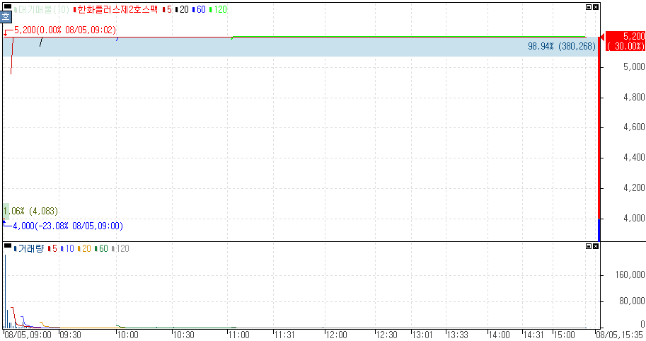 신규 상장 첫날 상한가를 기록한 한화플러스제2호스팩 주가 입니다.