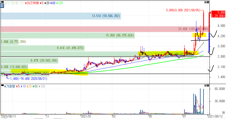 2025년까지 백신 생산 5대 강국 도약, 5년간 2.2조원 투입 소식으로 mRNA 백신을 개발중인 큐라티스 관련주로 부각을 받으면서 상한가를 기록한 아즈텍WB 주가 입니다.
