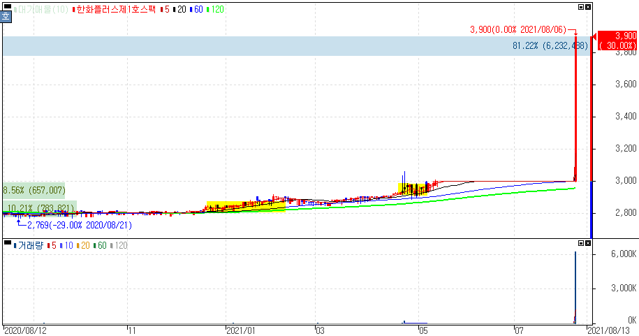 세림비앤지와 스팩합병 승인 소식으로 상한가를 기록한 한화플러스제1호스팩 주가 입니다.