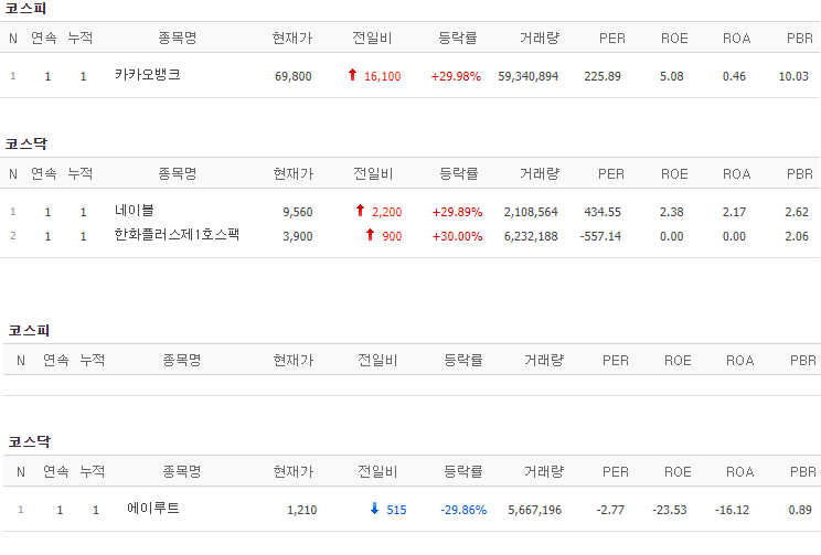 코스피에서는 카카오뱅크가 상한가를 기록했고, 코스닥에서는 네이블, 한화플러스제1호스팩이 상한가를 기록했습니다. 반면 에이루트가 하한가를 기록했습니다.