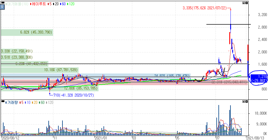재료미노출 하한가를 기록한 에이루트 주가 입니다.