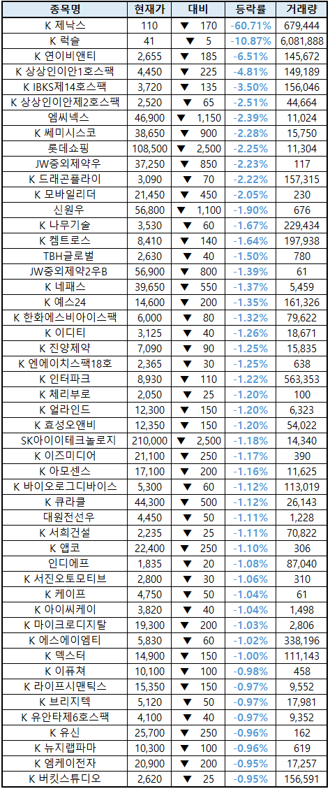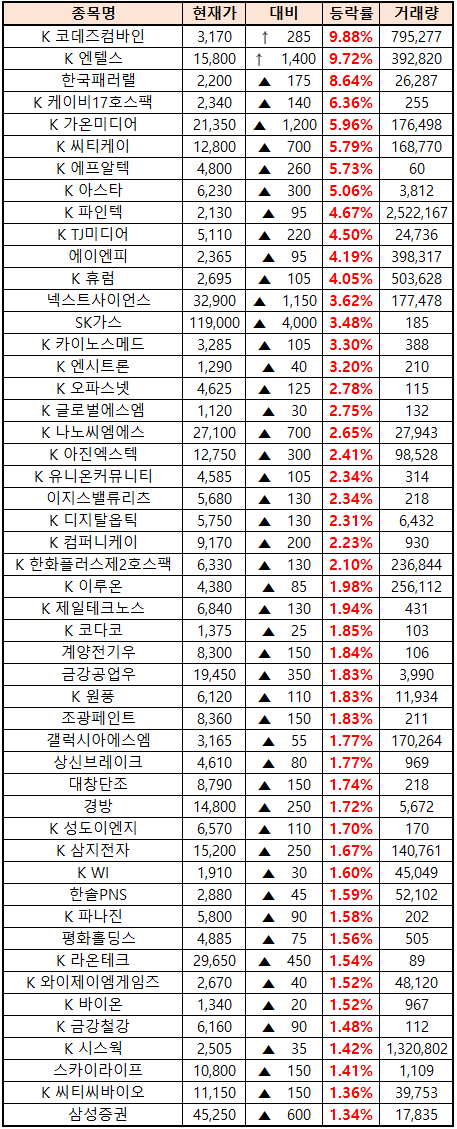 (종목명 앞에 'K'는 코스닥 종목을 의미합니다.)