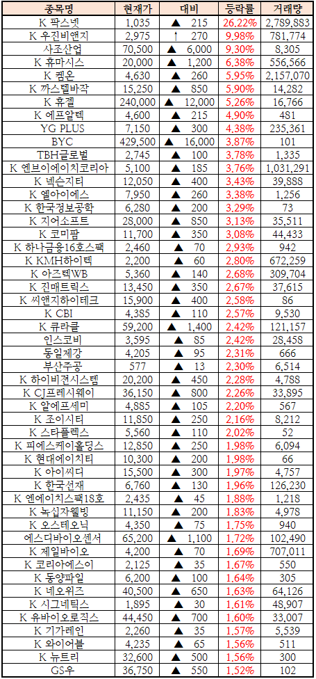 (종목명 앞에 'K'는 코스닥 종목을 의미합니다.)