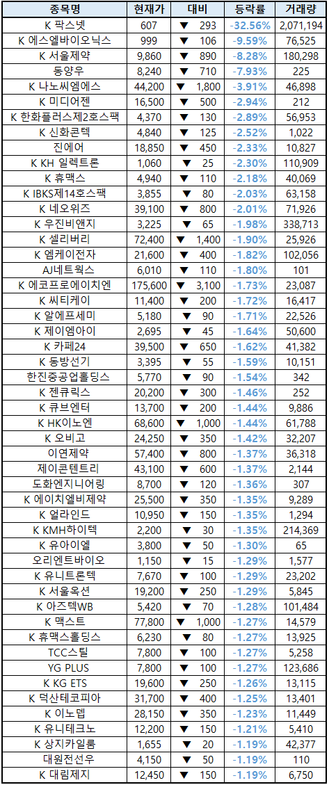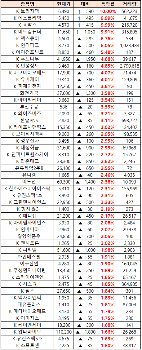 (종목명 앞에 'K'는 코스닥 종목을 의미합니다.)