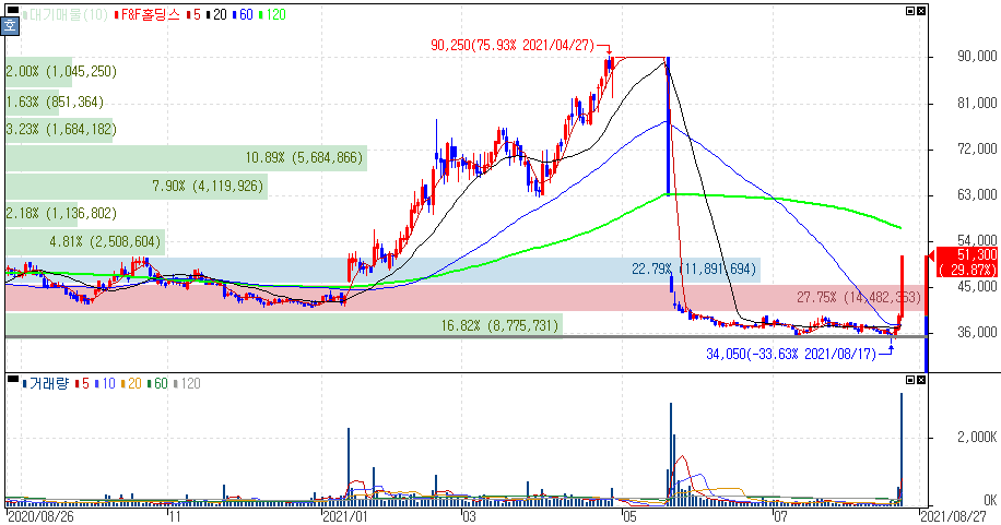 F&F홀딩스는 지난 F&F 회사분할로 이후 인한 거래재개 후 주가 급락을 보였는데요. 당시에는 지주사 전환이 되면서 기업가치를 낮게 보는 시각으로 급격한 하락을 보였습니다. 그러나 횡보세를 이어진 이후 금일 상한가를 기록하면서 크게 상승한 상황입니다.