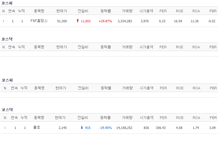 코스피에서는 F&F홀딩스가 상한가를 기록했고, 코스닥에서는 상한가 종목이 없었습니다. 반면 하한가로 율호가 코스닥에서 나왔습니다.