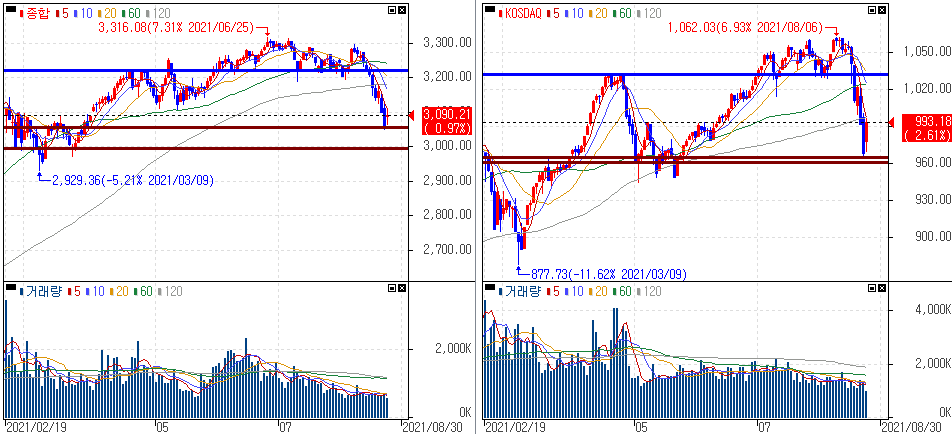 금일 코스피 지수는 +0.97% 상승한 3,090.21에 마감하였고, 코스닥 지수는 +2.61% 상승한 993.18에 마감하였습니다. 테이퍼링 속도 조절에 주목을 받으면서 반발 매수세가 함께 보여졌습니다.