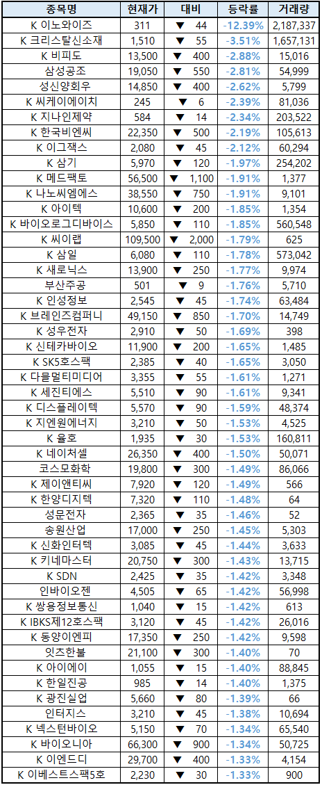 (종목명 앞에 'K'는 코스닥 종목을 의미합니다.)