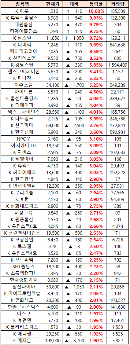 시간외 단일가매매 종가 종목 확인시 단순 급등주 등락률만 볼 것이 아니라, '거래량'에 따르는 거래대금도 판단하면서 보는 것이 중요합니다.
