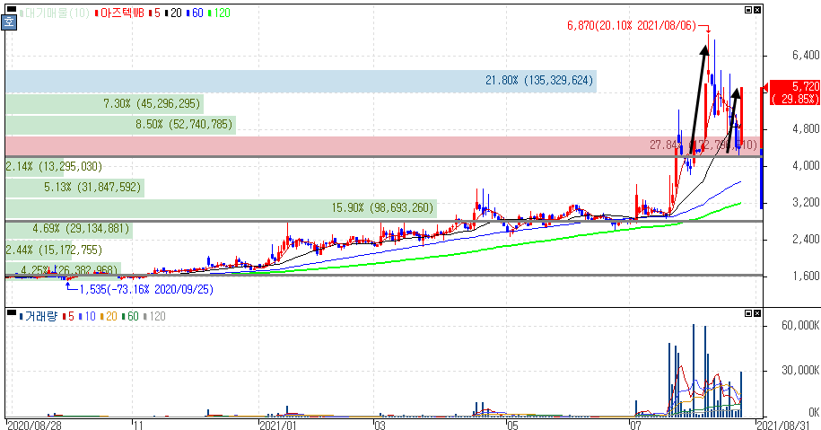 큐라티스, 국내 mRNA 코로나19 백신 임상 가장 빠르다는 소식 속 관련주로 부각되면서 상한가를 기록한 아즈텍WB 주가 입니다.