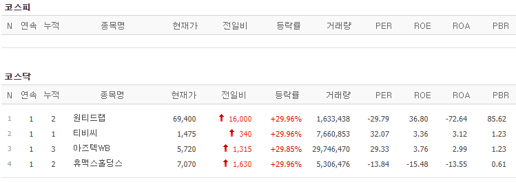 코스피에서는 상한가 종목이 없었고, 코스닥에서는 원티드랩, 티비씨, 아즈텍WB, 휴맥스홀딩스가 상한가를 기록했습니다.