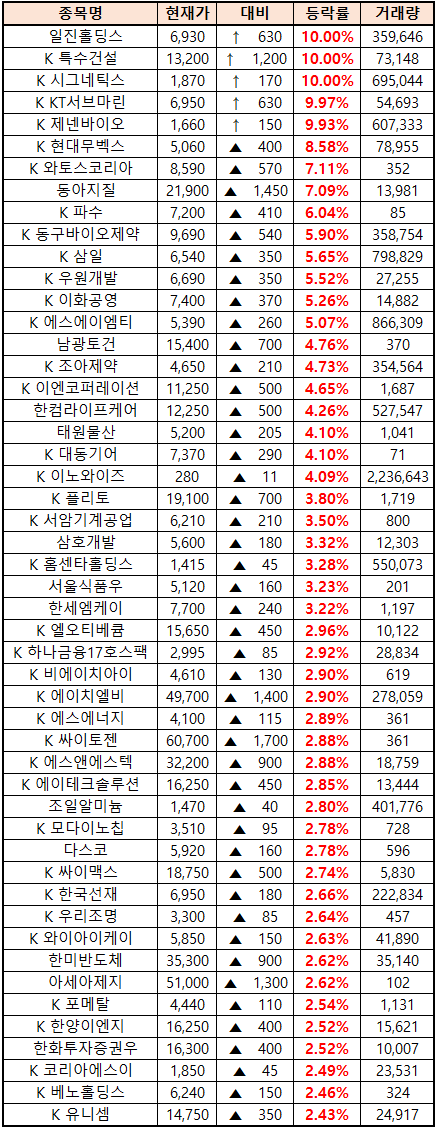 (종목명 앞에 'K'는 코스닥 종목을 의미합니다.)
