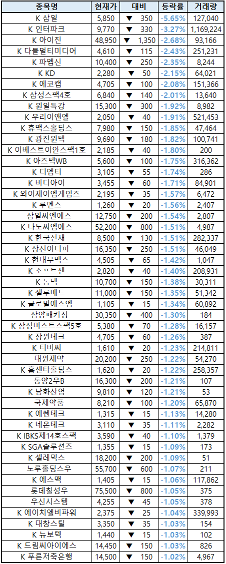 시간외 단일가매매 종가 종목 확인시 단순 급등주 등락률만 볼 것이 아니라, '거래량'에 따르는 거래대금도 판단하면서 보는 것이 중요합니다.(종목명 앞에 'K'는 코스닥 종목을 의미합니다.)