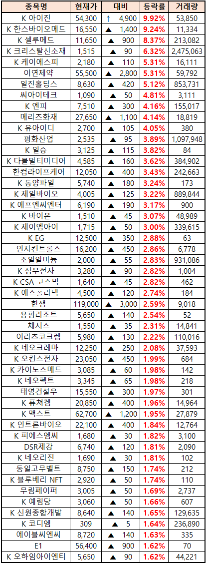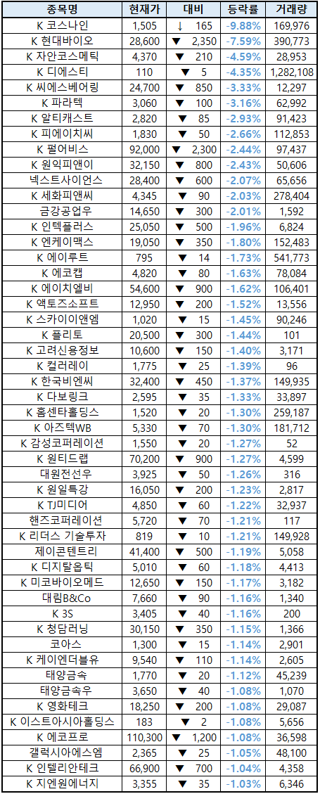 (종목명 앞에 'K'는 코스닥 종목을 의미합니다.)