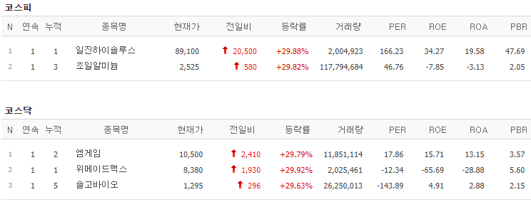 코스피에서는 일진하이솔루스, 조일알미늄이 상한가를 기록했고, 코스닥에서는 위메이드맥스, 솔고바이오가 상한가를 기록했습니다.