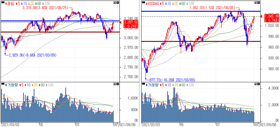 금일 코스피 지수는 +0.24% 상승한 3,207.02에 마감하였고, 코스닥 지수는 +0.74% 상승한 1,045.98에 마감하였습니다. 8월 한국 수출호조 속 외국인 매수세가 들어오면서 상승을 보였습니다.