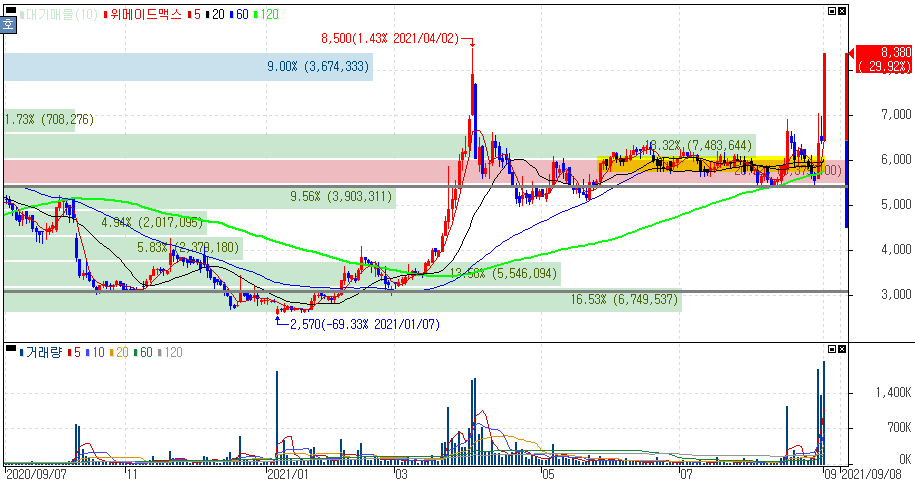 글로벌 블록체인 게임 개발사로 전환 선언 소식에 상한가를 기록한 위메이드맥스 주가 입니다.