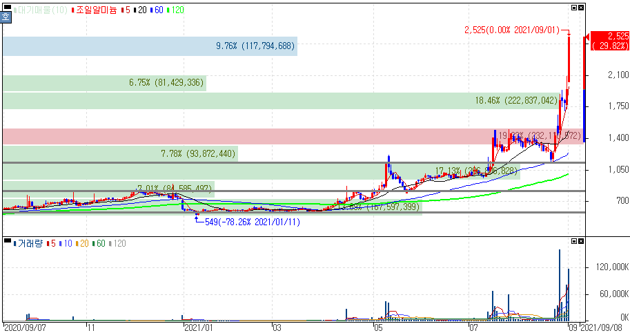 알루미늄 선물 가격 10년 내 최고 수준 소식으로 상한가를 기록한 조일알미늄 주가 입니다.