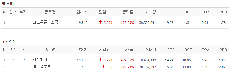 코스피에서는 코오롱플라스틱이 상한가를 기록했고, 코스닥에서는 일진파워, 재영솔루텍이 상한가를 기록했습니다.