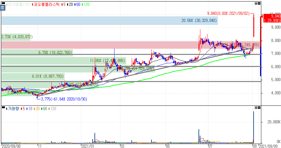 3분기 역대 최대 실적 전망 및 저평가 분석 등에 상한가를 기록한 코오롱플라스틱 주가 입니다.
