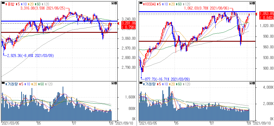 금일 코스피 지수는 +0.79% 상승한 3,201.06에 마감하였고, 코스닥 지수는 +0.64% 상승한 1,053.85에 마감하였습니다. 美 증시 호조 영향에 상승했던 우리증시는 코스피 4거래일째 외국인의 순매수가 이어지면서 상승을 보였습니다.