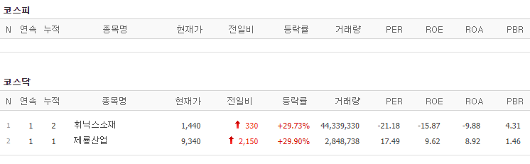 코스피에서는 상한가 종목이 없었고, 코스닥에서는 휘닉스소재, 제룡산업이 상한가를 기록했습니다.