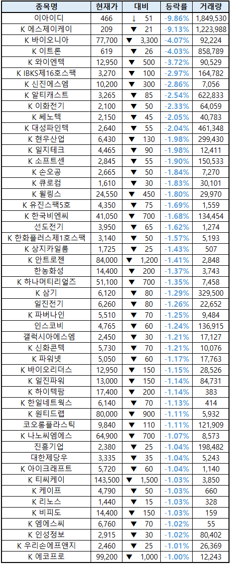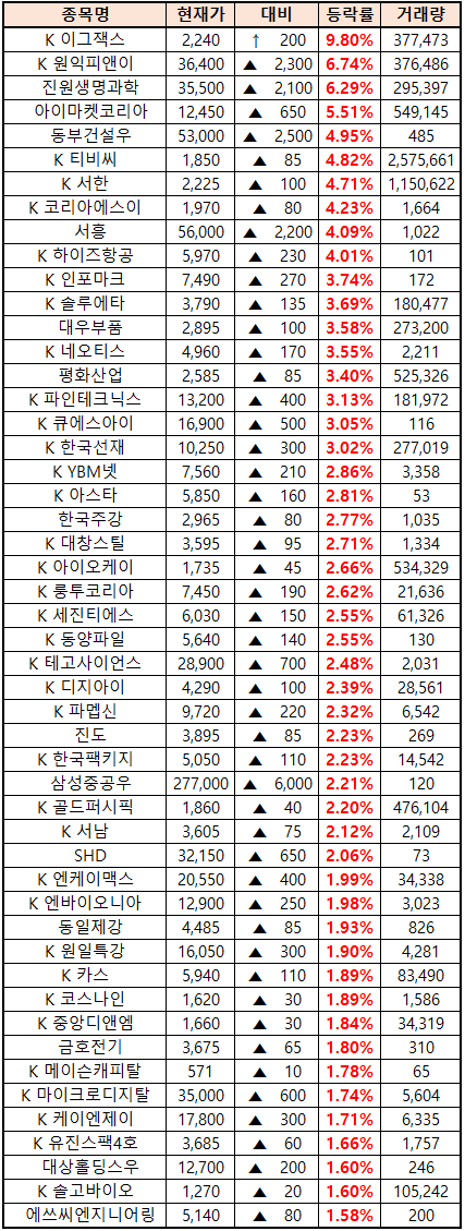 (종목명 앞에 'K'는 코스닥 종목을 의미합니다.)