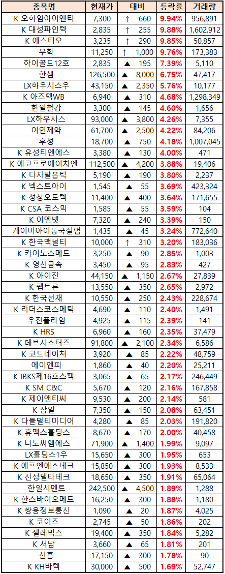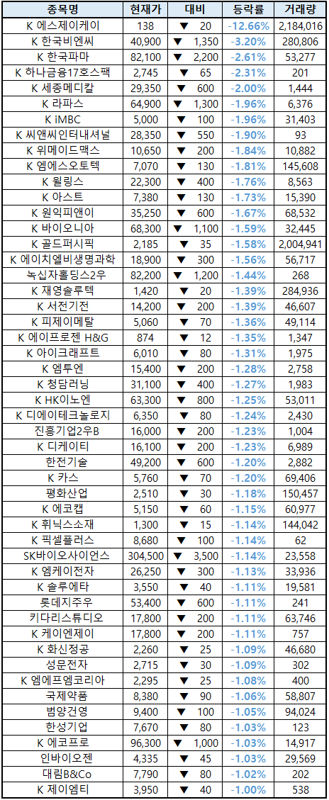 (종목명 앞에 'K'는 코스닥 종목을 의미합니다.)
