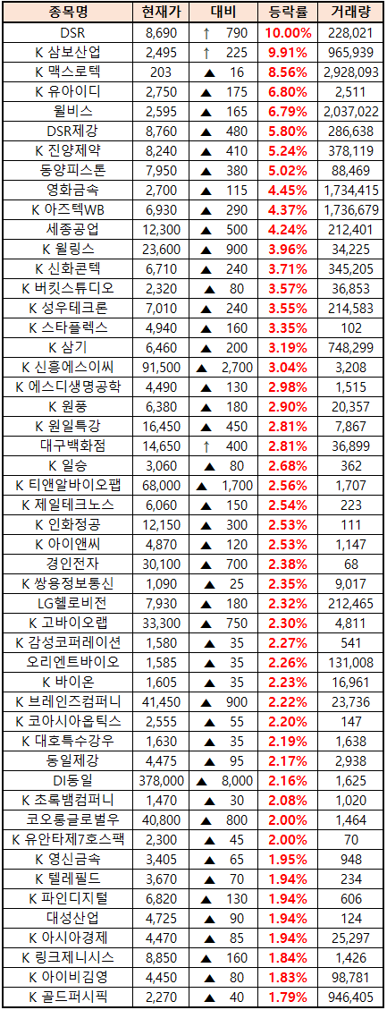 시간외 단일가매매 종가 종목 확인시 단순 급등주 등락률만 볼 것이 아니라, '거래량'에 따르는 거래대금도 판단하면서 보는 것이 중요합니다.