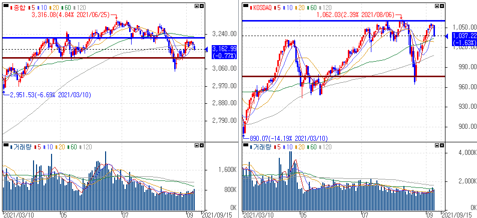 금일 코스피 지수는 -0.77% 하락한 3,162.99에 마감하였고, 코스닥 지수는 -1.63% 하락한 1,037.22에 마감하였습니다. 외국인의 매도물량에 낙폭이 확대된 가운데 저항구간 오차범위내 기준으로 하락을 보여주고 있습니다. 내일은 네마녀의날 입니다.