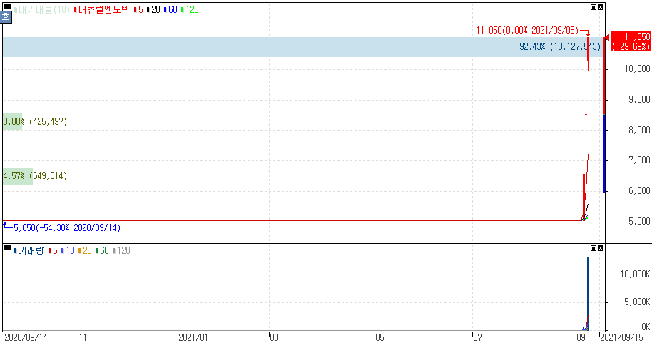 거래재개 3거래일 연속 상한가를 기록한 내츄럴엔도텍 주가 입니다.