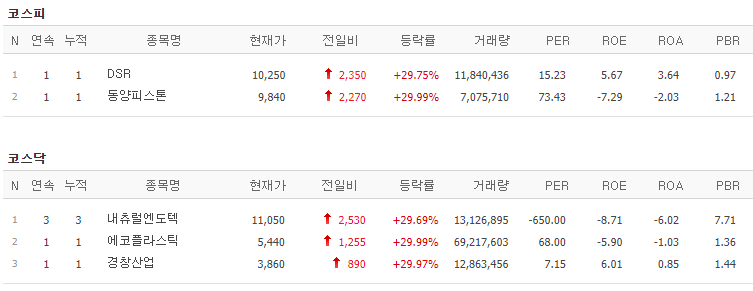 코스피에서는 DSR, 동양피스톤이 상한가를 기록했고, 코스닥에서는 내츄럴엔도텍, 에코플라스틱, 경창산업이 상한가를 기록했습니다.