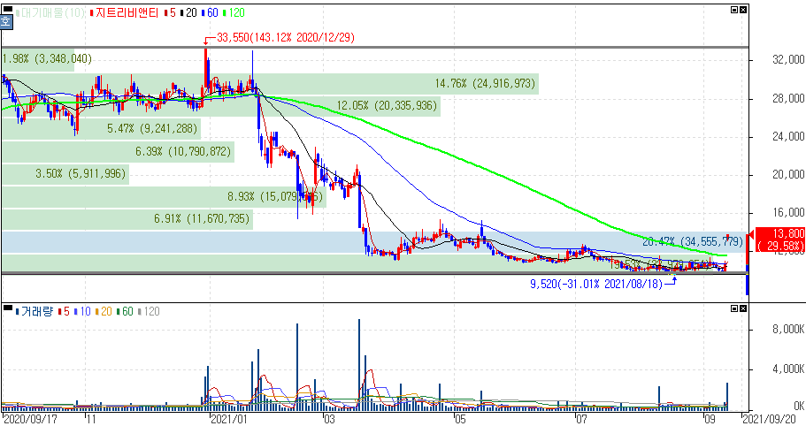 아시겠지만 과거 에이치엘비와 지트리비엔티는 나란히 임상3상을 추진하면서 허위공시 의혹으로 받았던 종목이죠. 이러했던 리스크는 오늘 상한가에도 택도 없는 급락률을 보여왔다는 점을 생각해 볼 수 있습니다.