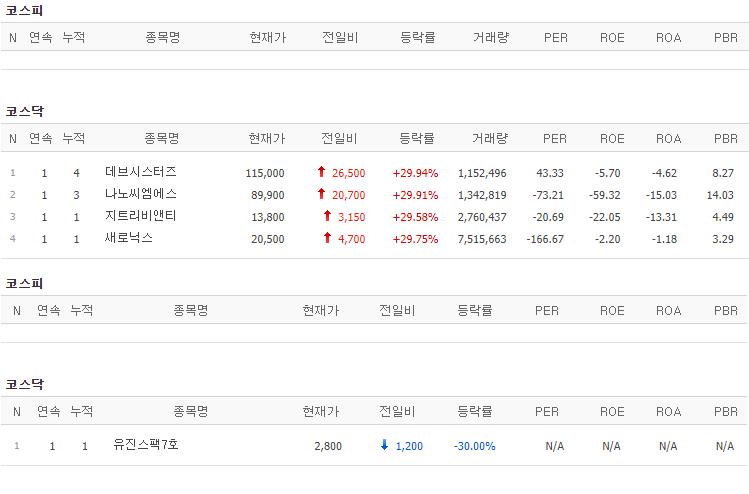 코스피에서는 상한가 종목이 없었고, 코스닥에서는 데브시스터즈, 나노씨엠에스, 지트리비앤티, 새로닉스가 상한가를 기록했습니다. 반면 유진스팩7호가 하한가를 기록했습니다.