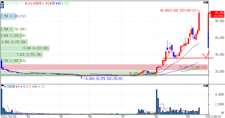 재료미노출(바이러스 박멸 램프 모멘텀) 상한가를 기록한 나노씨엠에스 주가 입니다.