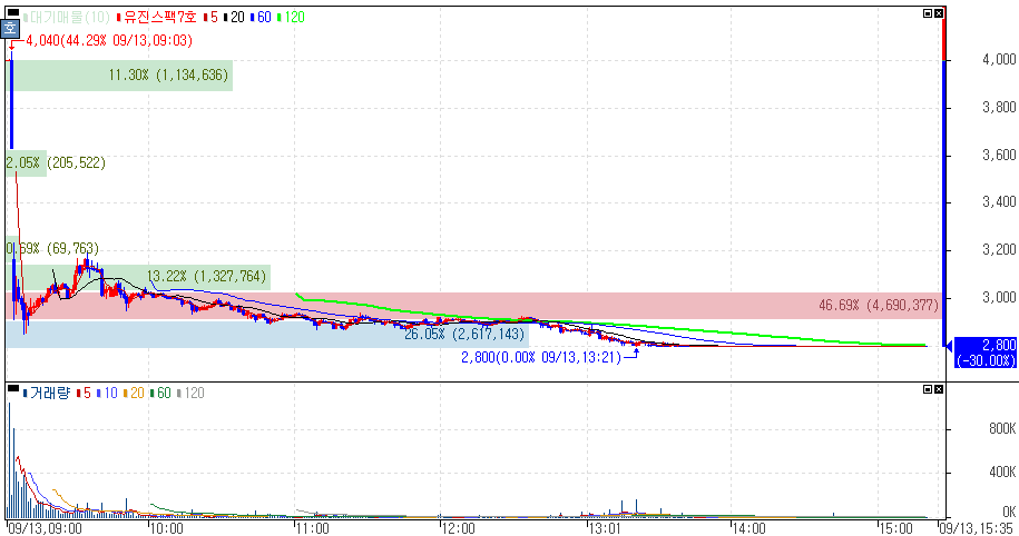 신규상장 첫날 급락으로 하한가를 기록한 유진스팩7호 주가 입니다.