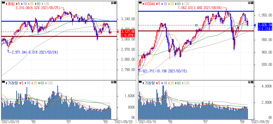 금일 코스피 지수는 +0.07% 상승한 3,127.86에 마감하였고, 코스닥 지수는 -1.11% 하락한 1,026.34에 마감하였습니다. 美 증시가 물가 최대폭 상승으로 연내 테이퍼링 가능성이 올라가면서 국내증시에도 영향을 받은 모습이나 외국인과 기관의 매수세에 코스피 강보합으로 보였습니다.