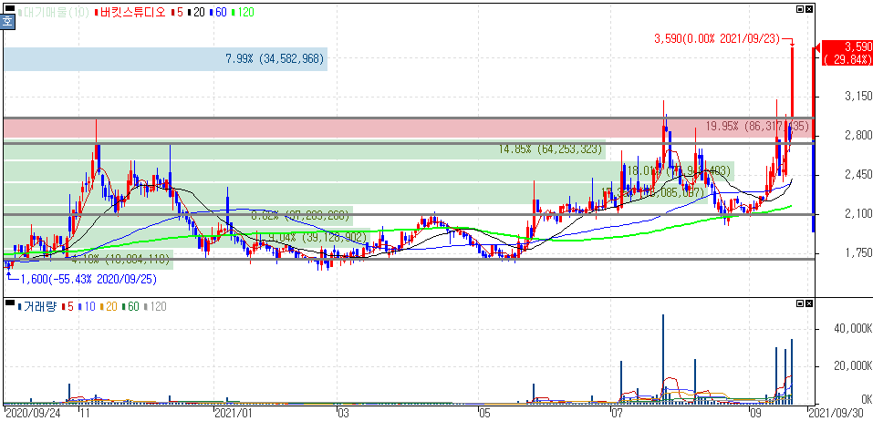 넷플릭스 오리지널 시리즈 '오징어 게임' 美 1위 소식에 상한가를 기록한 버킷스튜디오 주가 입니다.