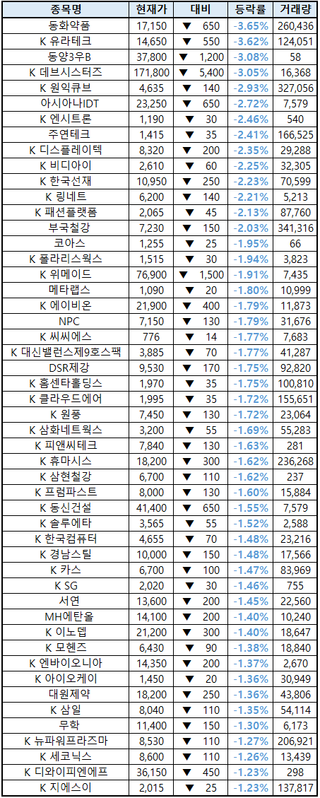(종목명 앞에 'K'는 코스닥 종목을 의미합니다.)