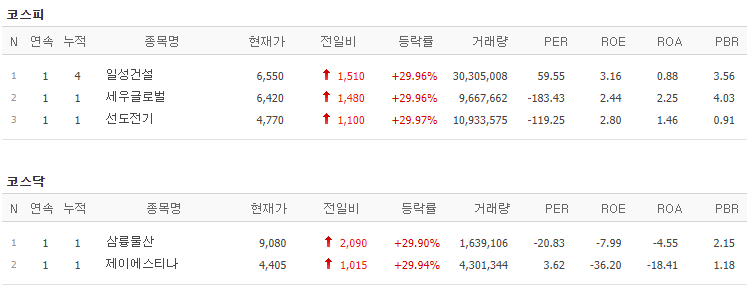코스피에서는 일성건설, 세우글로벌, 선도전기가 상한가를 기록했고, 코스닥에서는 삼륭물산, 제이에스티나가 상한가를 기록했습니다.