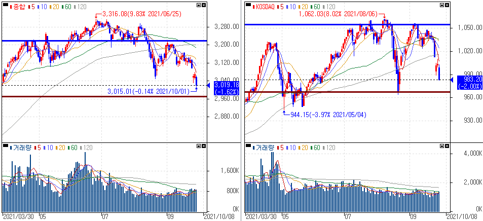 금일 코스피 지수는 -1.62% 하락한 3,019.18에 마감하였고, 코스닥 지수는 -2.00% 하락한 983.20에 마감하였습니다. 美 재정지출을 둘러싼 불확실성 확대로 국내 증시까지 영향을 받는 모습입니다.