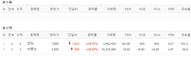 코스피에서는 상한가 종목이 없었고, 코스닥에서는 엔피, 바른손이 상한가를 기록했습니다.