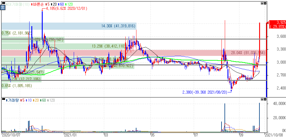 최근 '바이오엔텍, 모더나' 지분과 관련해 주가 변동성이 컸던 바른손인데 최근 '오징어 게임'의 흥행으로 '영화', '영상콘텐츠' 관련주 강세 속에서 봉준호 관련주(기생충) 성향으로 전환된 모습이라고 확인해 볼 수 있습니다.