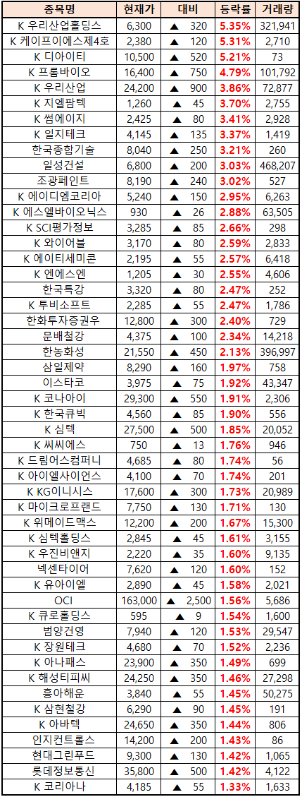 (종목명 앞에 'K'는 코스닥 종목을 의미합니다.)