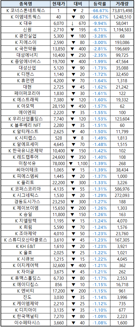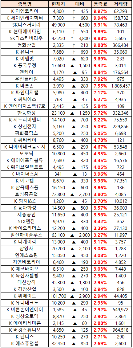 (종목명 앞에 'K'는 코스닥 종목을 의미합니다.)