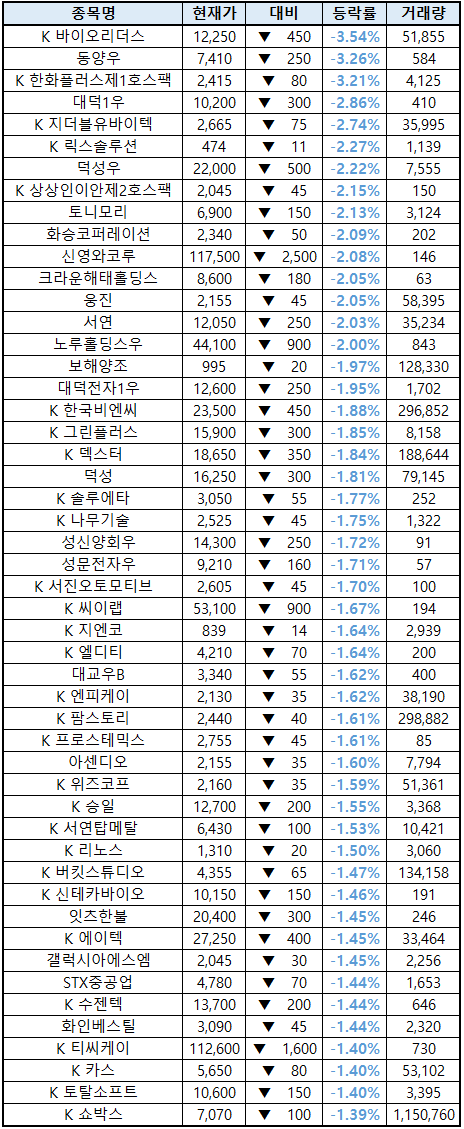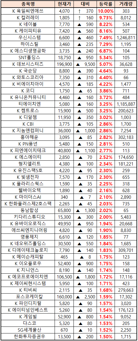 (종목명 앞에 'K'는 코스닥 종목을 의미합니다.)