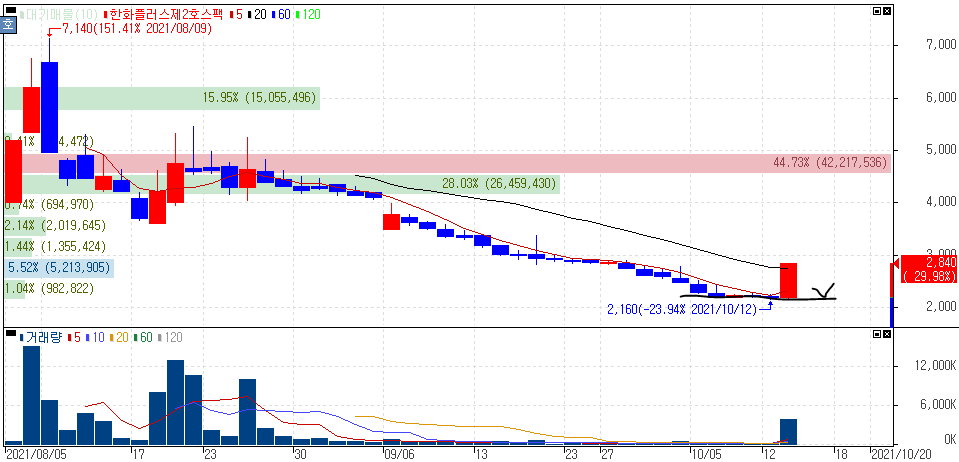 한화플러스제2호스팩은 스팩주(기업인수목적회사)임에도 불구하고 상장 당시 상당한 상승을 보여준 종목이지만 고점 대비 상당히 하락을 보였습니다. 스팩주 특성상 수급이 들어오면 등락폭이 큰 변동성을 쉽게 보여줄 수 있으나 수급이 빠진다면 침체 구간이 길 수 있다는 것도 참고해서 종목을 보아야 합니다.